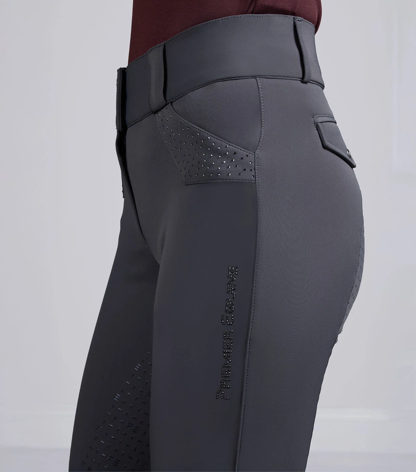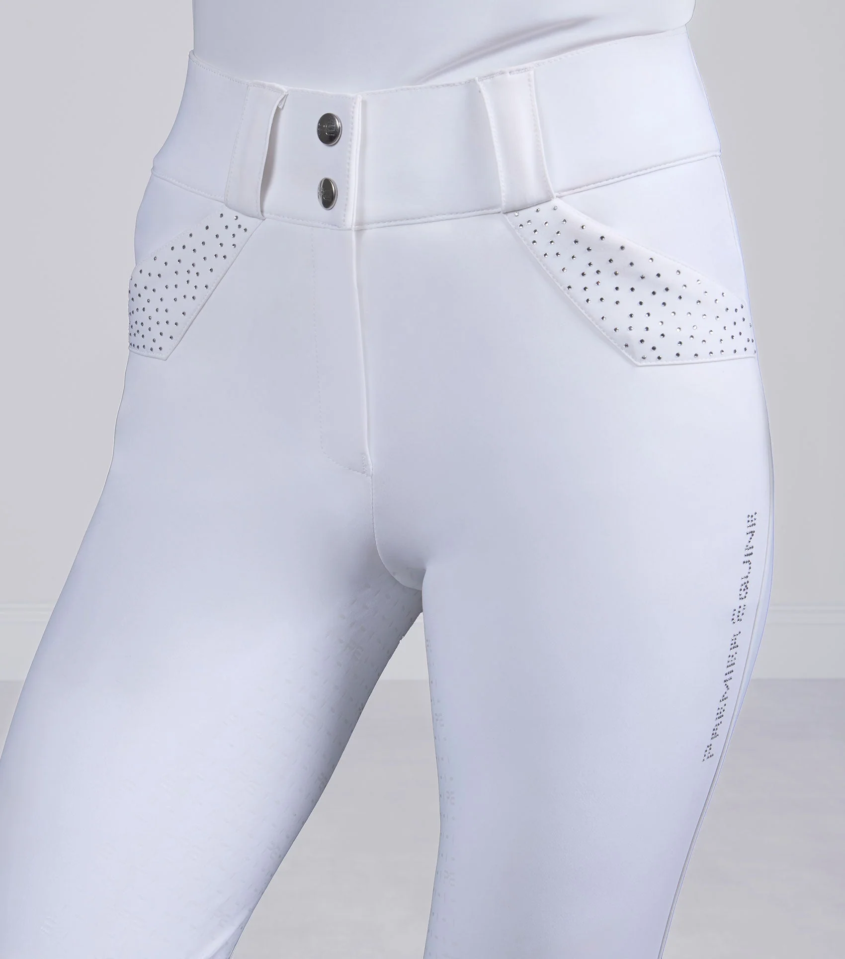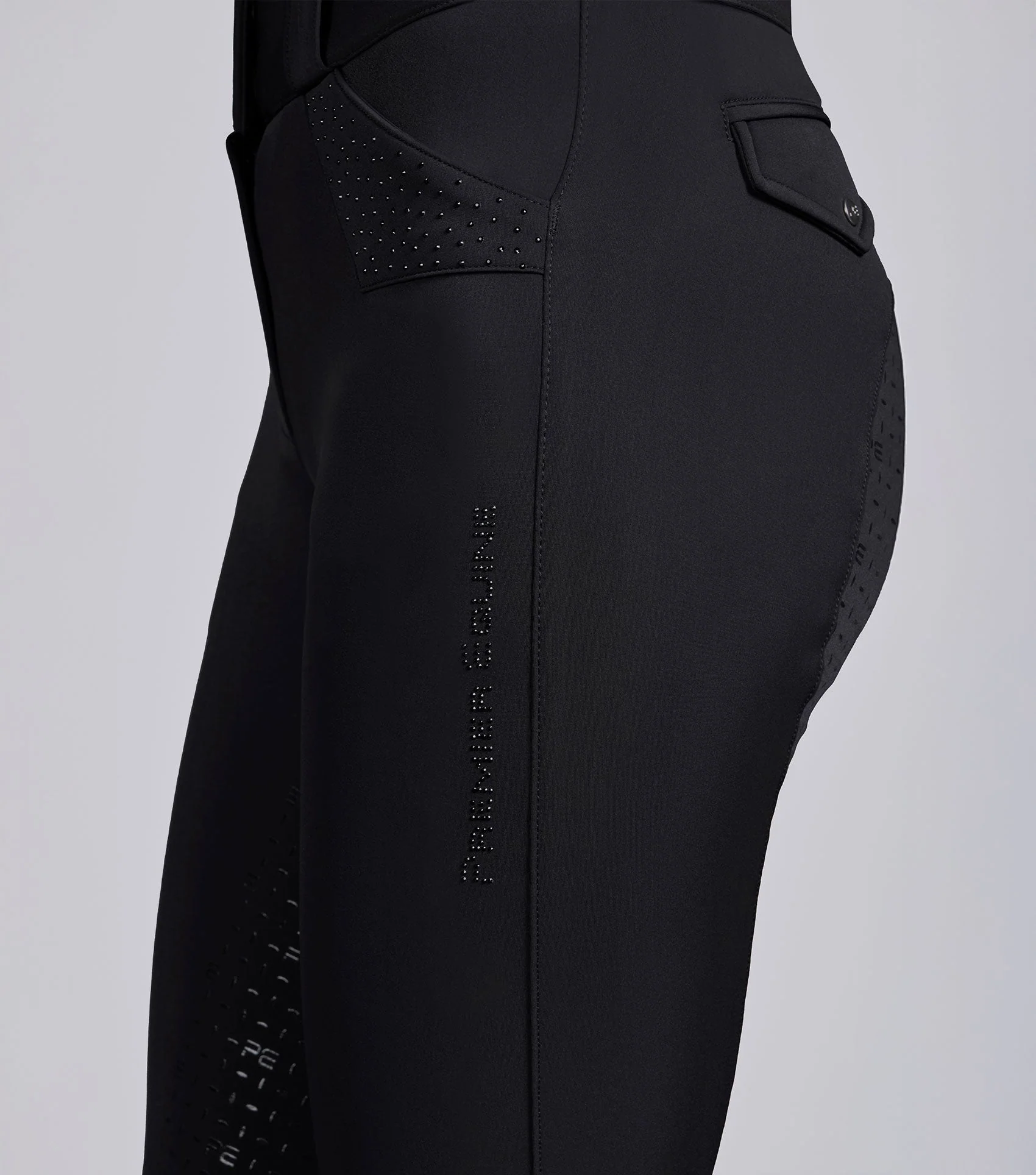 Jazdecké nohavice Torino s podporným vysokým pásom a hladkým, lemovaným povrchom ponúkajú pevné uchytenie, ktoré lichotí postave. Dve predné krížové vrecká v štýle džínsov dodávajú klasický nádych; každé z nich je zdobené trojuholníkovou nášivkou z rovnakého materiálu a elegantnými ozdobami z umelých diamantov, ktoré dodávajú náznak lesku.