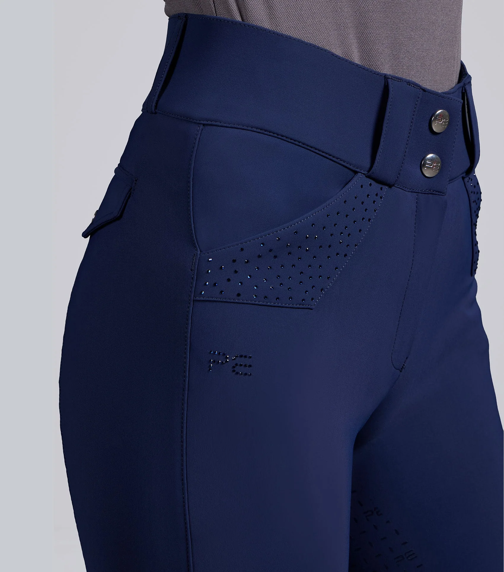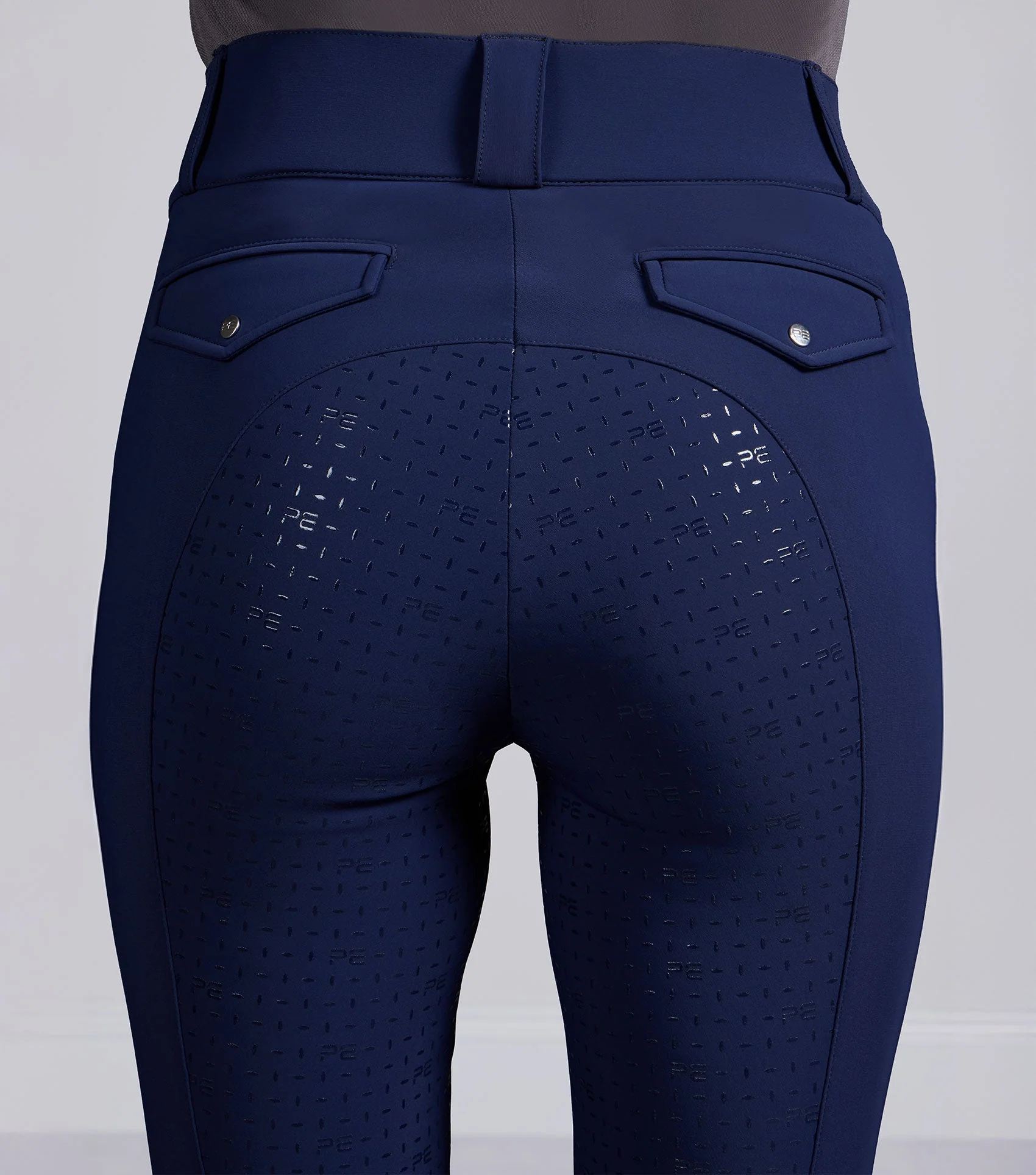 Zadná časť je zdobená dvoma vreckami s imitáciou klop, ktoré sú zakončené lemovaním z rovnakého materiálu a jemným diamantovým logom PE, ktoré dodáva charakteristický, elegantný vzhľad. Plná sedová časť s gélom s logom PE zaisťuje optimálnu priľnavosť a kontrolu, zatiaľ čo gélové logo PE poskytuje extra stabilitu a elegantný, moderný vzhľad.
