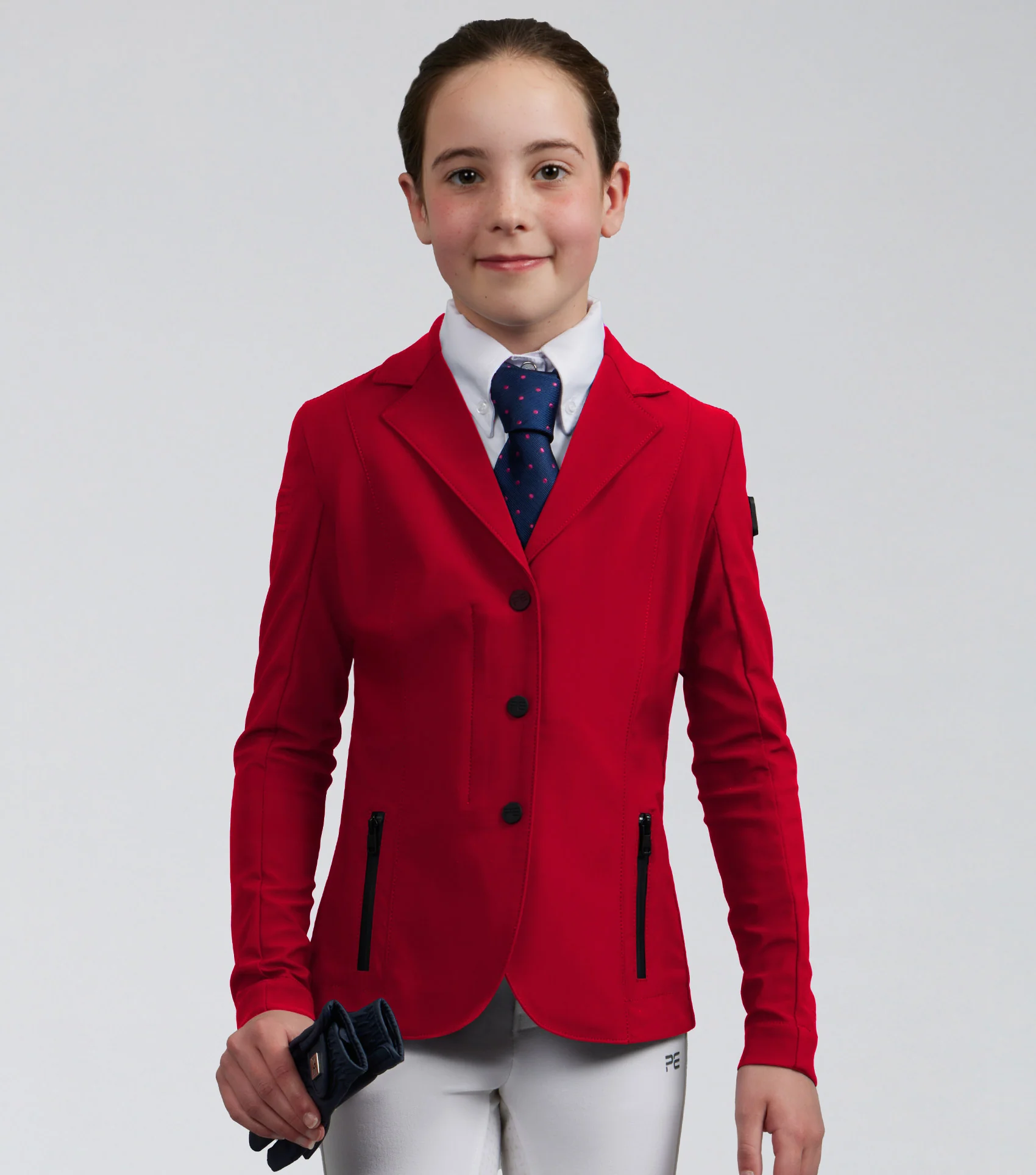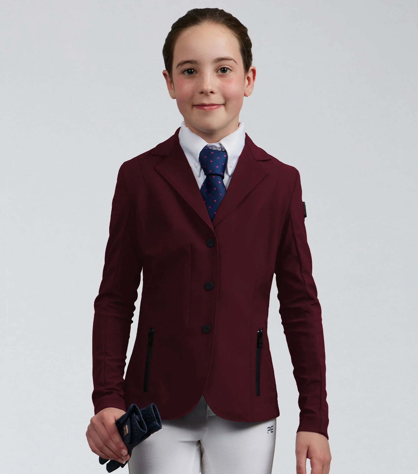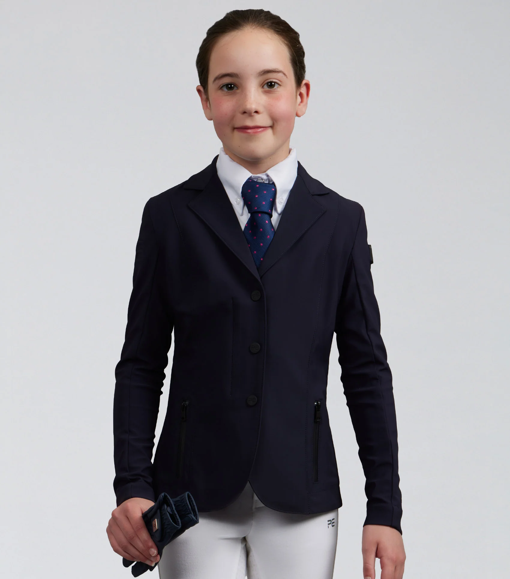 Toto dievčenské súťažné sako je ideálne na rôzne jazdecké disciplíny. Toto sako je vyrobené z ľahkého hladkého materiálu, ktorý je luxusne mäkký na dotyk a príjemný na pokožku. Konštrukcia poskytuje viacsmerný streč pre väčšiu voľnosť pohybu a zároveň ponúka lepšiu priedušnosť, čo je ideálne pre intenzívne súťaže