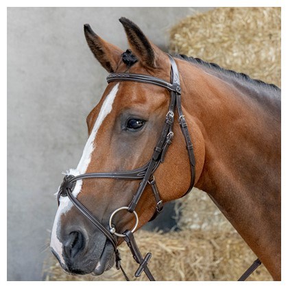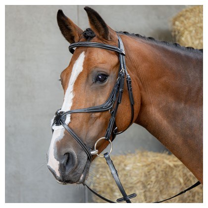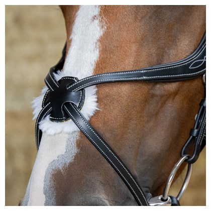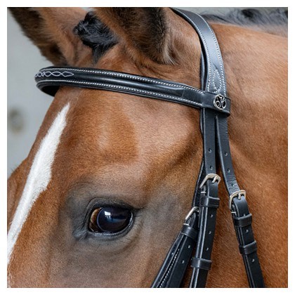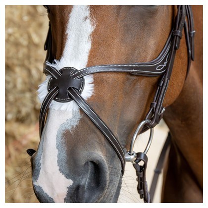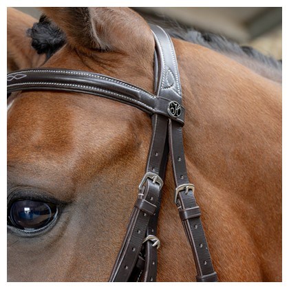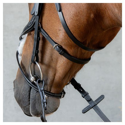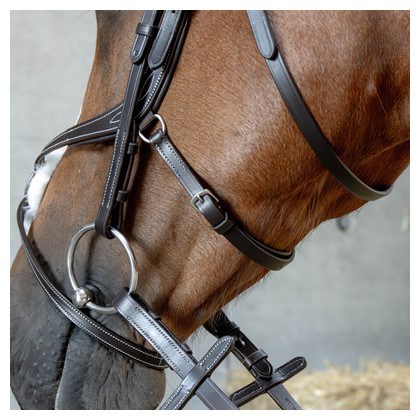 Kožená uzda s anatomicky tvarovaným mexickým nánosníkom a anatomickou čelenkou. Má mäkké polstrovanie a kontrastné prešívanie na čelenke a nánosníku