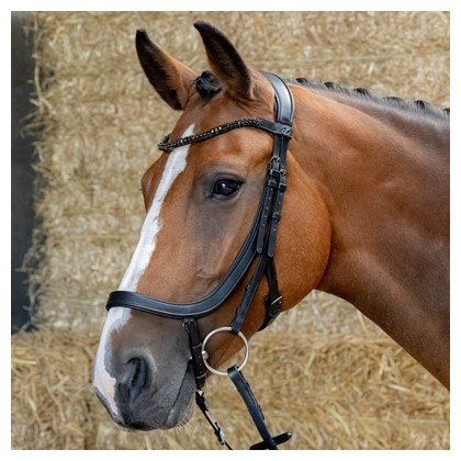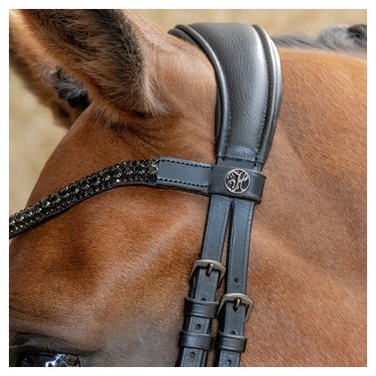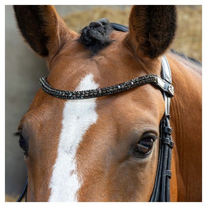 Prémiová kožená uzda s anatomickým strihom, navrhnutá pre maximálny komfort a lepší výkon. Má štýlovú čelenku s trblietavými kryštálmi a elegantnými prackami v farbe gunmetal.