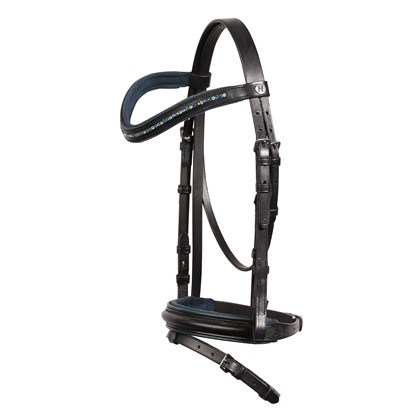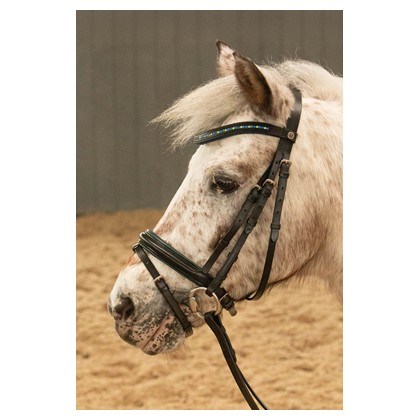 Kožená uzda s farebnými kryštálmi na čelenke. Nánosník má farebné lemovanie a mäkké polstrovanie. Skryté zapínanie na lícnych častiach. Súčasťou sú oťaže s remienkami a zarážkami.